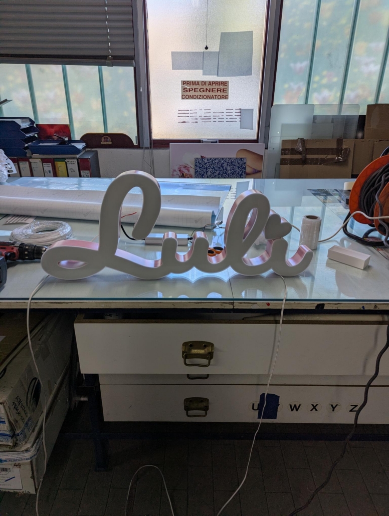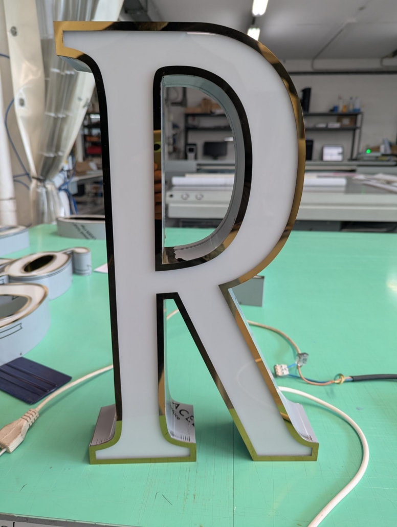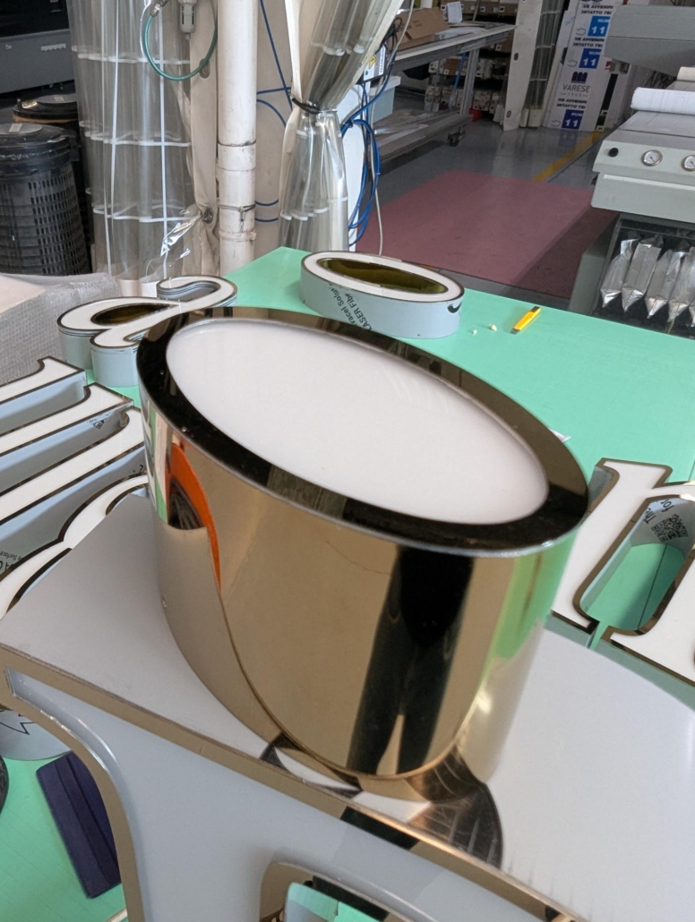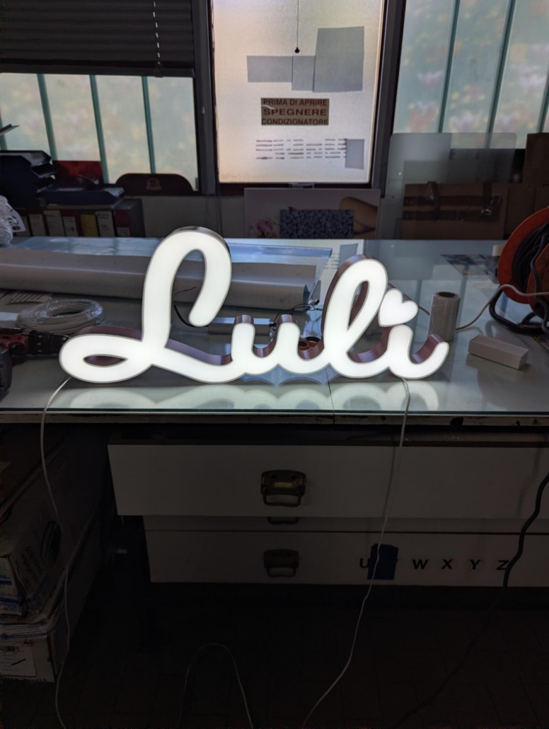 Il corpo delle lettere può essere realizzato in alluminio, acciaio inox, plexiglas, ottone, lamiera o PVC e non ci sono limiti di forma o dimensione. Il frontale è in plexiglas opalino.