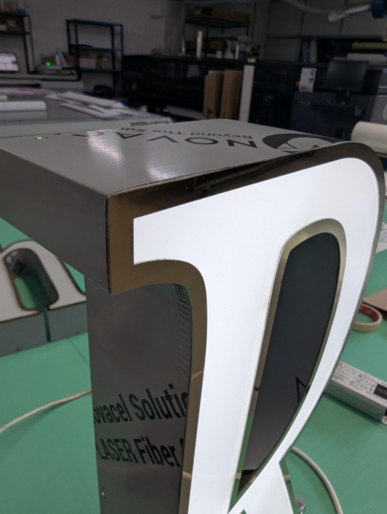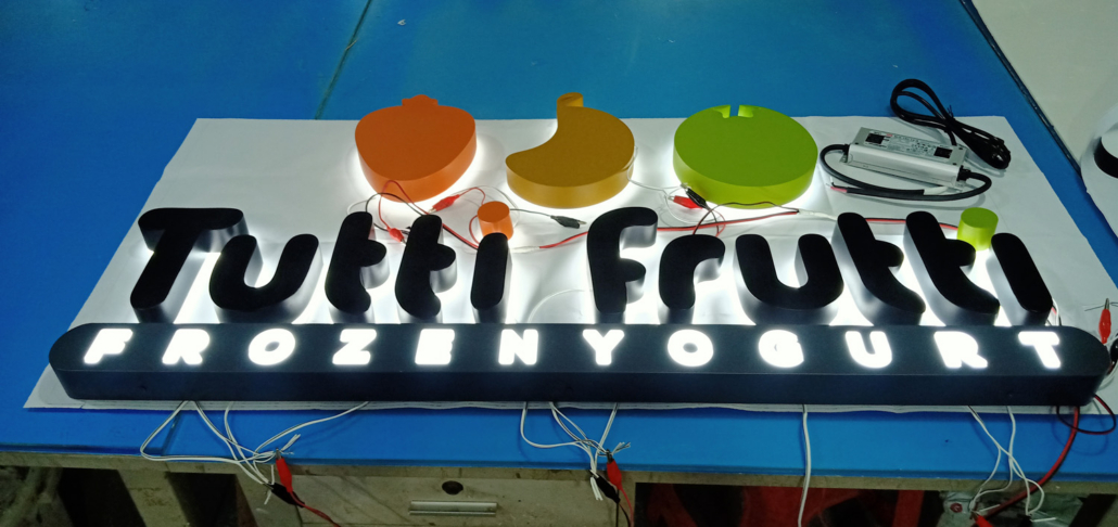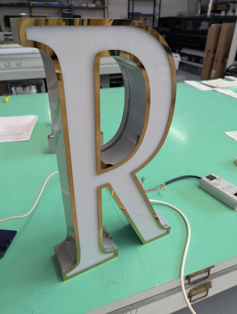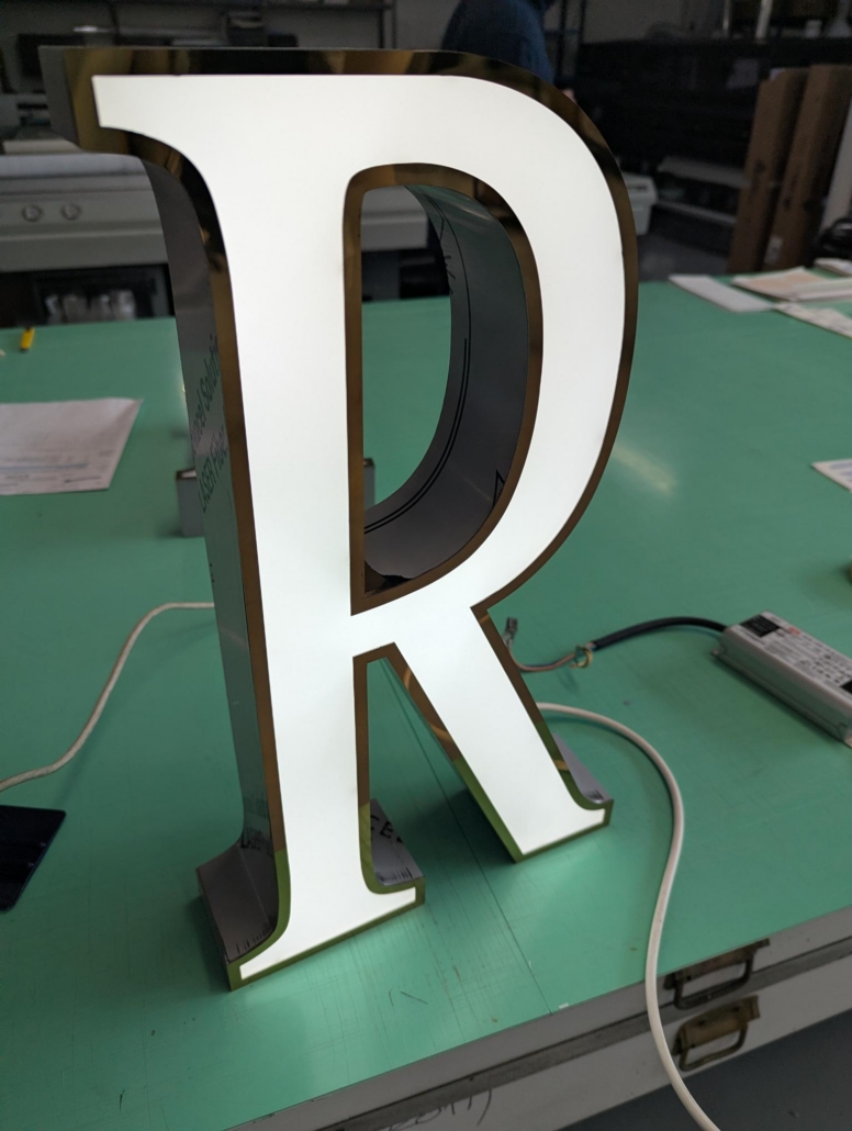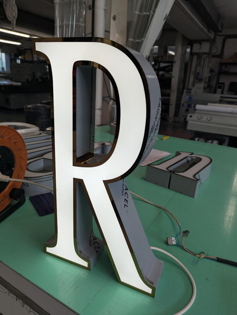 Il corpo delle lettere può essere realizzato in alluminio, acciaio inox, plexiglas, ottone, lamiera o PVC e non ci sono limiti di forma o dimensione. Il frontale è in plexiglas opalino.
